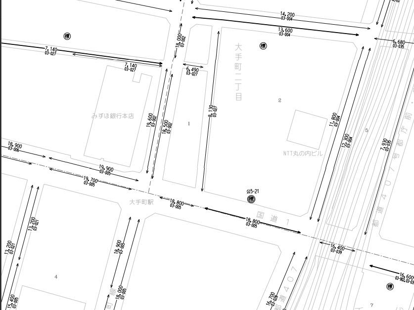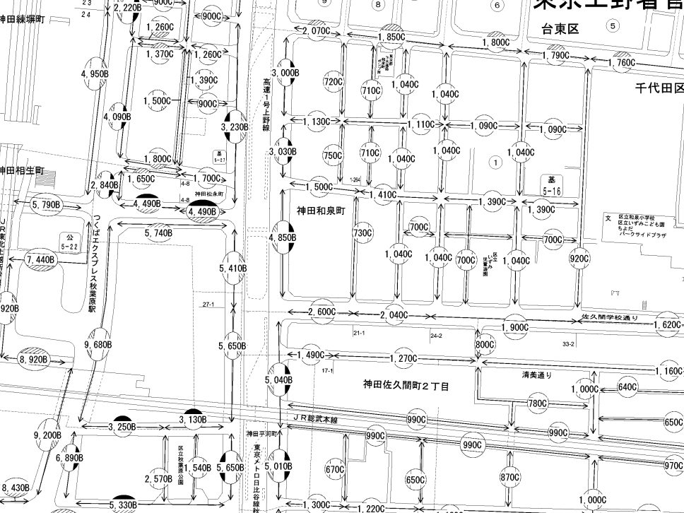 上記は東京都千代田区の固定資産税路線価を記した図です。道路ごとに数字が書かれているのが分かると思いますが、これが1㎡あたりの地価(千円単位)です。路線ごとの固定資産税路線価に土地の面積をかけて求めた値が、その土地全体の地価となります。