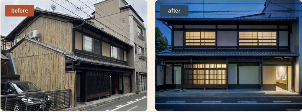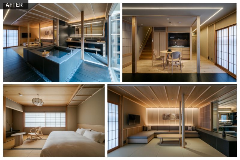 さらに外部から玄関までスロープを設け、バリアフリーにも対応。京都の街並みに調和しながら、訪れる人に安心と特別な滞在体験を提供する古民家再生の事例となりました。
