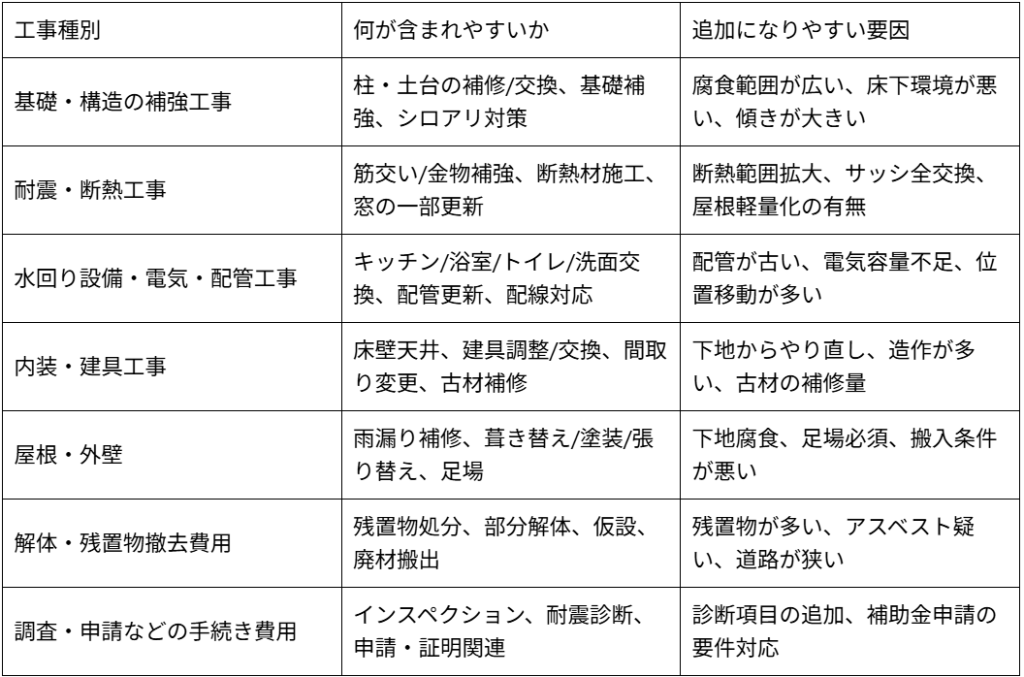 古民家再生の費用で一番つまずきやすいのは「どこまで直すか」を決めないまま見積もりを取り、途中で工事範囲が膨らんでしまうことです。古民家は、床下の腐朽やシロアリ、雨漏りによる下地の傷み、古い配管・配線の破損などが発生しやすく、いざ開けてみたら追加工事が起こりやすい傾向があります。