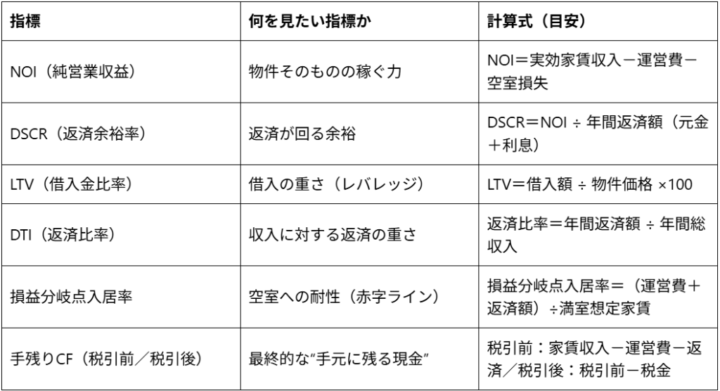 そこで役に立つのが、稼ぐ力を表す「NOI」、返済の余裕をチェックできる「DSCR」、最終手残りを把握するための「手残りCF」の3点です。これらをしっかり見ておくと、収益に波があったときの強さが判断しやすくなります。