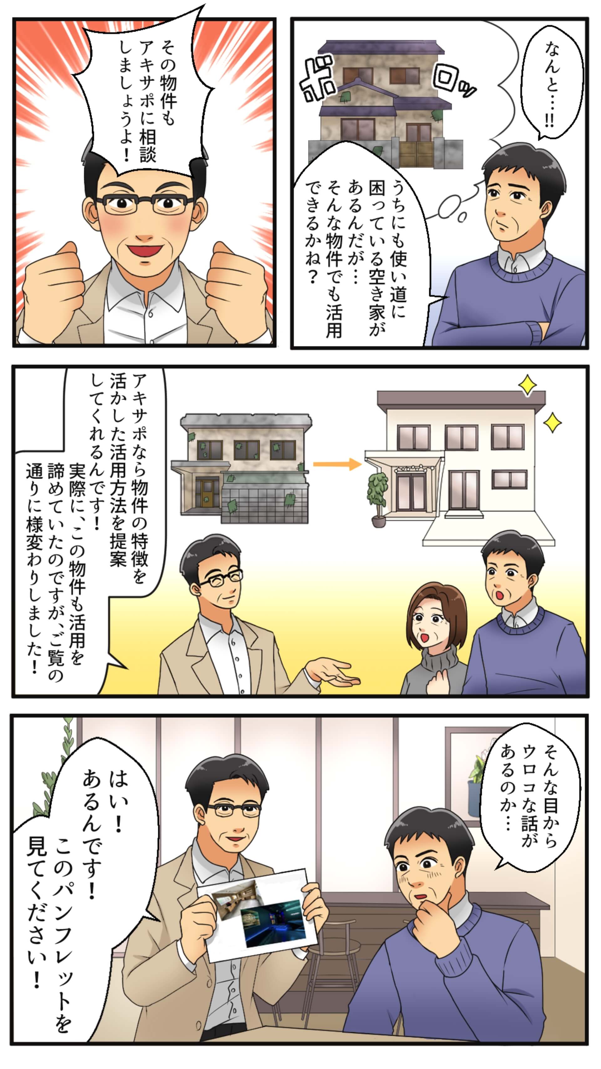 - 活用することを主軸に検証をおこないますが、ご売却・管理など、空き家に関する問題を包括的に解決するサービスを提供しております。豊富な実績・経験を持つアキサポ担当から総合的な解決策をご提案させていただきます。
